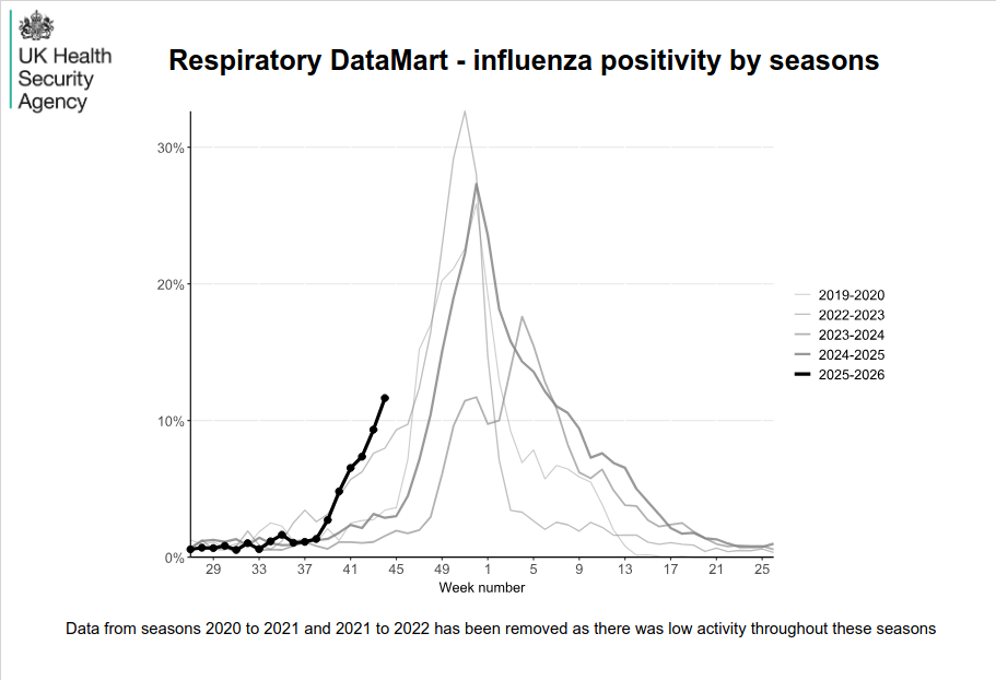 Großbritannien, das Land der alarmierenden Schlagzeilen, ist da schon deutlich weiter. Dort nimmt die nationale Infektionsschutzbehörde UKHSA die Prozentzahl der positiven Tests als Maß der Virusaktivität. Bereits im Oktober war dort ein deutlicher Anstieg festzustellen. Damit begann die Welle früher als in den letzten Jahren, selbst früher als die Grippewelle 2022/23, die als erste nach dem Ende der COVID-Maßnahmen schon unüblich früh einsetzte:
