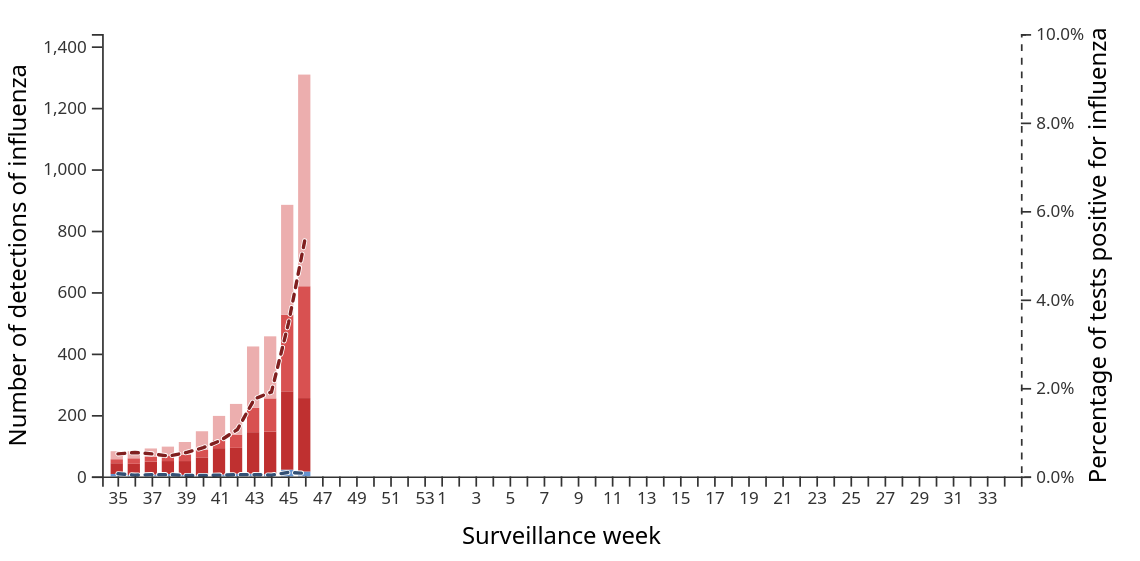 "In Woche 46 des Jahres 2025 lag die Zahl der Patienten, die sich mit Symptomen einer Atemwegserkrankung, einschließlich grippeähnlicher Erkrankungen, in der Primärversorgung vorstellten, in allen meldenden Ländern auf dem Ausgangswert oder auf einem niedrigen Niveau. Virologische Daten zeigen jedoch einen früher als erwarteten Anstieg, der drei bis vier Wochen früher als in den beiden letzten Saisonen und den fünf Saisonen vor der COVID-19-Pandemie."
