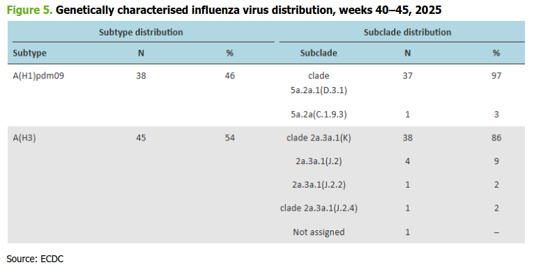 In den Ländern der EU, wo die Welle erst ganz zu Beginn steht, schaut es - bei noch sehr niedriger Gesamtzahl an Virussequenzierungen - ähnlich aus. Laut den Daten der europäischen Gesundheitsbehörde ECDC ist A(H3N2) gegenüber A(H1N1) zwar noch nicht ganz so dominant wie in UK, aber auch hier ist die K der dominante H3N2-Subtyp: