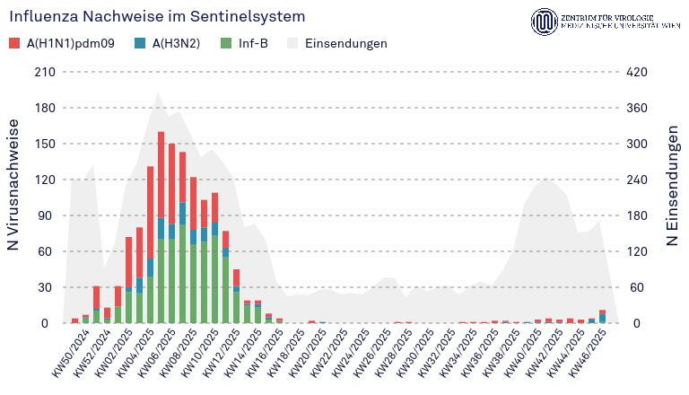 "In Österreich Anstieg der Influenzavirusnachweise, im Vergleich zu den vorhergehenden Saisonen etwa 2-4 Wochen früher."