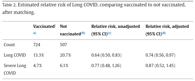 Laut diesem, sehr probaten Diagnosekriterium entwickelten 13,3% der geimpften und 20,7% der ungeimpften Jugendlichen Long Covid. Daraus ergibt sich eine relative Risikoreduktion von 36% durch die Impfungen. Nach einer statistischen Bereinigung von Störfaktoren (die geimpften Jugendlichen kamen im Durchschnitt aus bildungsnäheren Familien mit besserer medizinischer Versorgung) blieb immer noch eine signifikante Risikoreduktion von 26% über. Auch das Auftreten von schwerem Long Covid war bei den geimpften Jugendlichen mit 4,7% geringer als bei den ungeimpften (6,1%). Das war aber aufgrund der relativ geringen absoluten Zahl der Betroffenen zu gering für einen statistisch signifikanten Unterschied.