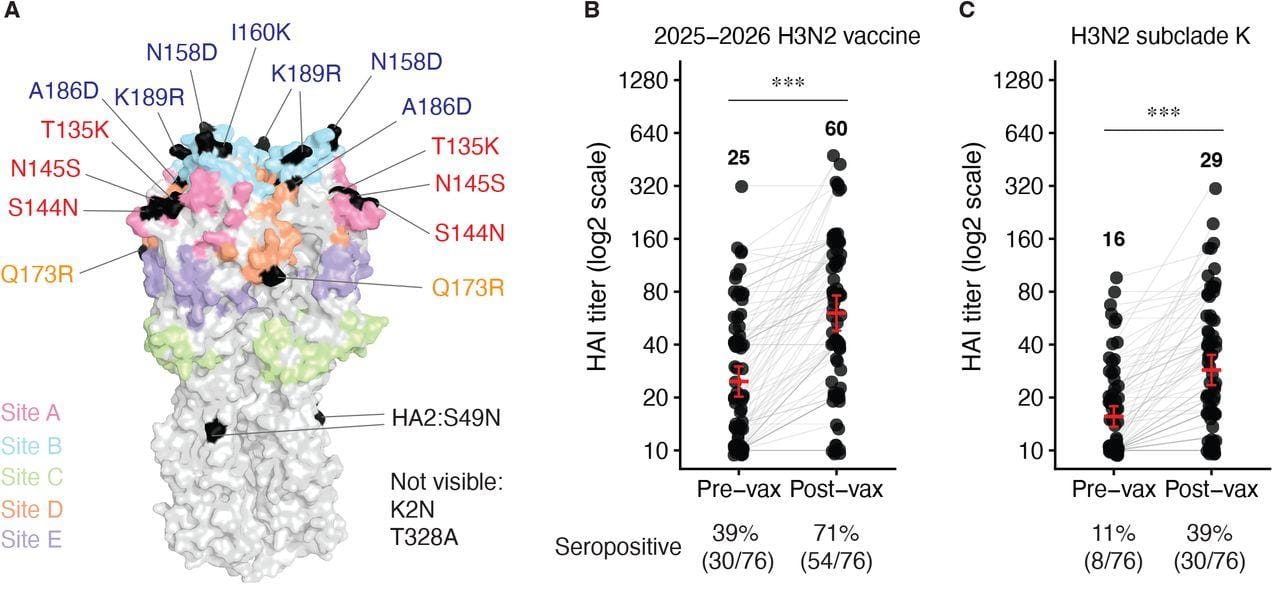 Die Wirksamkeit des aktuellen Impfstoffes wurde in einer ganz aktuellen Studie labordiagnostisch genauer untersucht („Antibodies elicited by the 2025-2026 influenza vaccine in humans“, allerdings erst als Preprint vorliegend). In den Serumproben von 76 Probanden wurden die Antikörpertiter vor sowie einen Monat nach der Impfung bestimmt. 39% der Probanden hatten einen wirksamen Antikörpertiter gegen eine frühere Subklade von H3N2, aber nur 11% gegen die neue Subklade K. Nach der Impfung hatten 71% einen wirksamen Titer gegen die frühere Subklade im Vergleich zu 39% gegen A(H3N2)K.