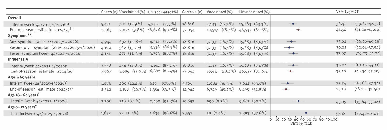 Nun erschien eine Studie aus Frankreich, bei der die Impfwirksamkeit bei einer weit größeren Zahl an Personen und über einen längeren Zeitraum erhob („Interim vaccine effectiveness against influenza virus among outpatients, France, October 2025 to January 2026“). Bei fast 25.000 Personen aus ganz Frankreich erfolgten PCR-Tests auf respiratorische Virusinfektionen. 22,5% von ihnen wurden positiv auf Influenza getestet. Anhand des Impfstatus dieser Personen errechneten die Forschenden eine Wirksamkeit von 36,4% gegen eine Grippeerkrankung (nicht gegen eine stationäre Aufnahme wie in der britischen Studie!). Wie üblich war die Wirksamkeit bei jüngeren Personen besser als bei den älteren. Die Ergebnisse waren tendenziell gering schlechter als in der Saison 2024/25, der Unterschied war aber nicht statistisch signifikant.