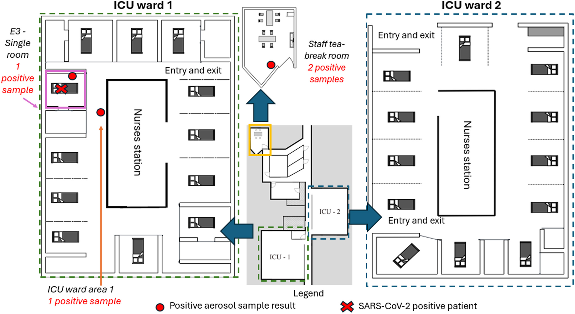 Auf der Intensivstation wurden nur vier Luftproben positiv auf SARS-CoV-2 getestet. Das waren je eine Probe im Isolationszimmer, in dem eine an COVID erkrankte Person behandelt wurde, und - trotz Infektionsschleuse - auf dem Flur vor dem Zimmer. Die anderen beiden positiven Proben wurden im Sozialraum des Personals entnommen. (Auch das überrascht mich nicht.)